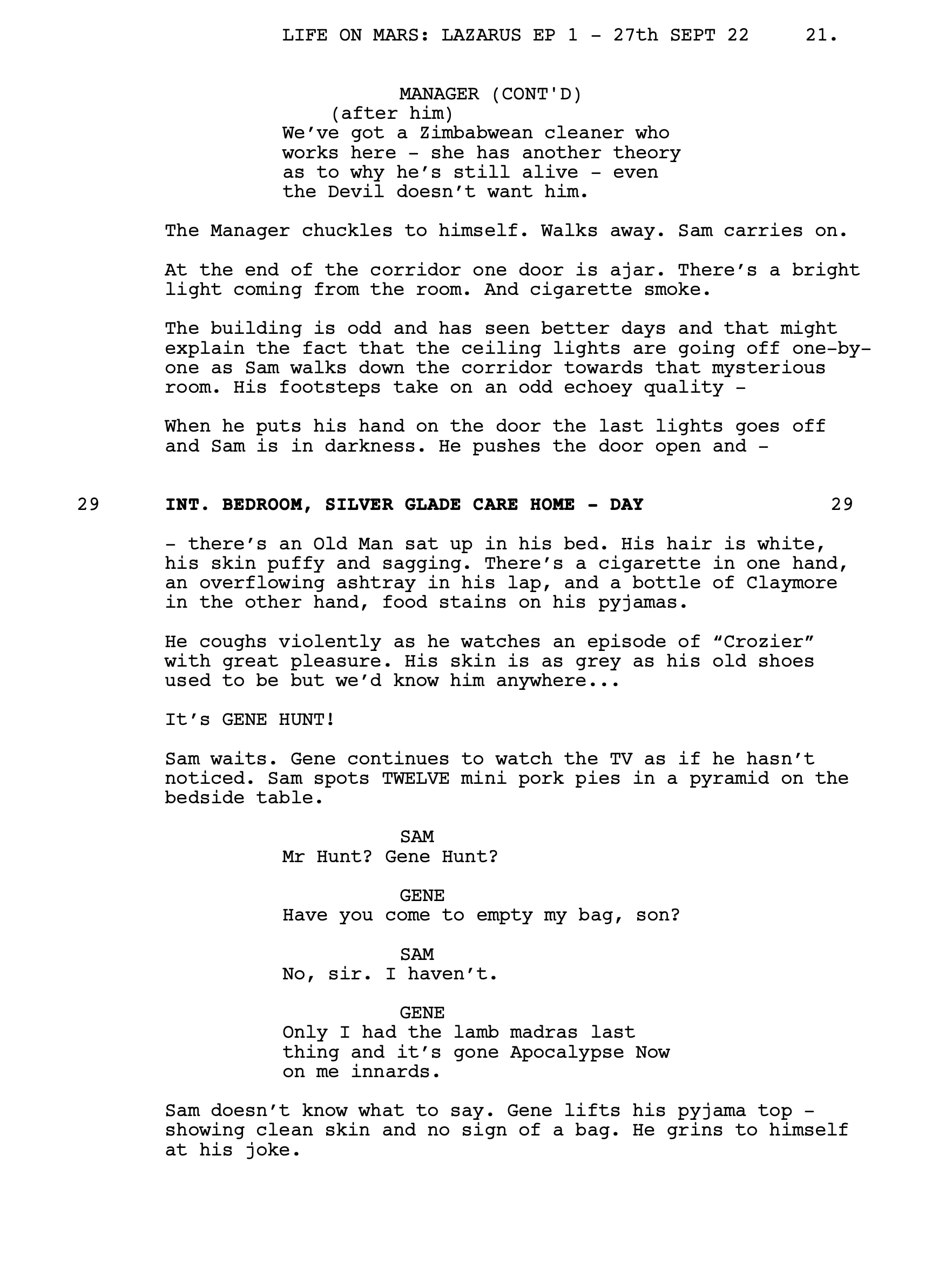 Together, they made up a pitch doc, and a pilot script, which opens in a post-Covid 2022, with Sam Tyler working for Greater Manchester Police’s Internal Affairs division. Then, after the murder of a corrupt police officer, the trail leads him to an old people’s home, where he comes into contact with a chain-smoking, curry-noshing, irascible 80-year-old by the name of… Gene Hunt.